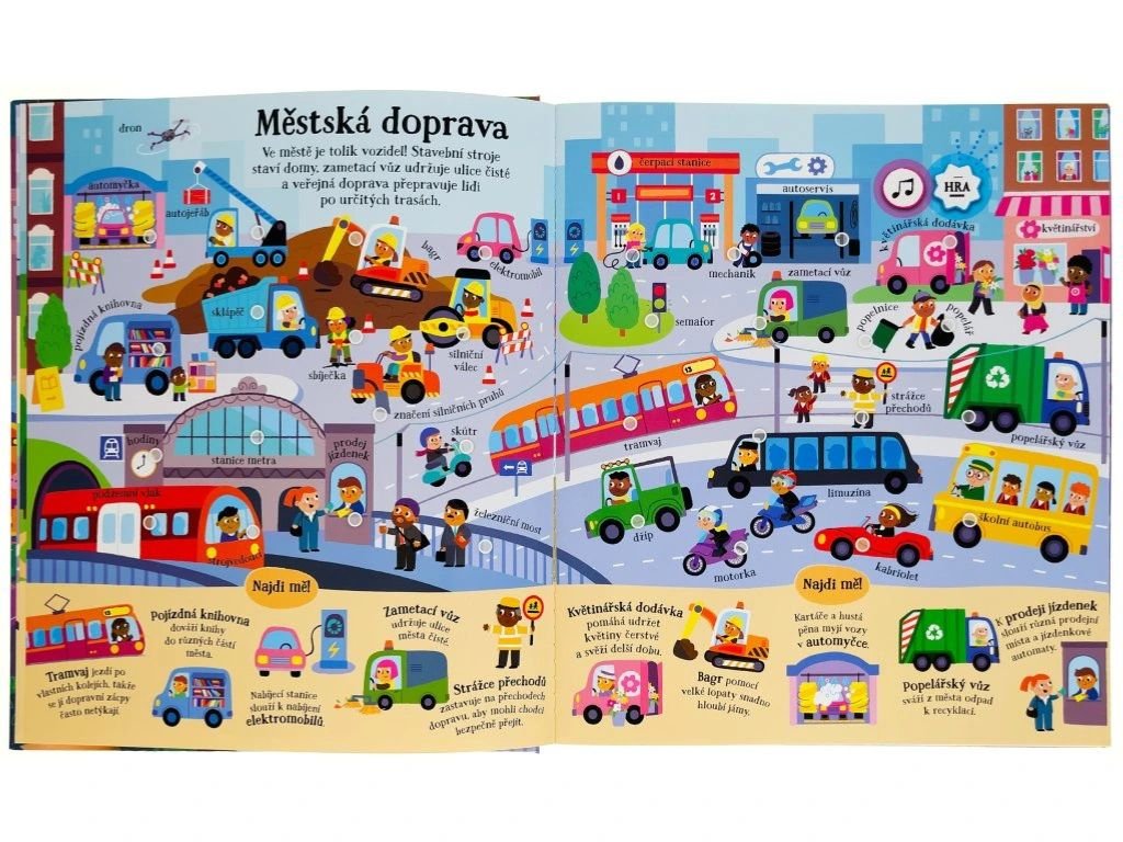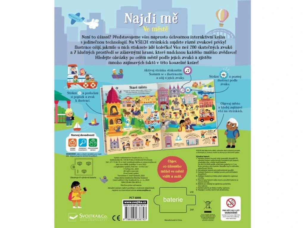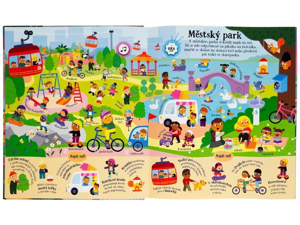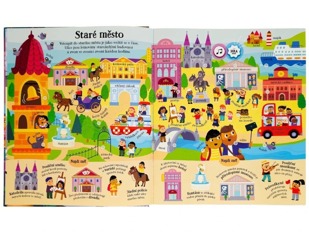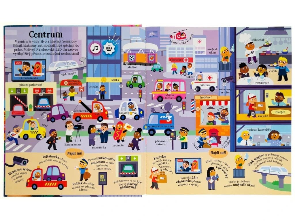 Objevujte na stránkách této úžasné zvukové knížky přes 200 zvuků z města! Celé město na stránkách doslova ožije, jakmile u ilustrací stisknete vyznačené místo. Tato kniha obsahuje jak skutečné zvukové prvky, tak i namluvené názvy míst, věcí, památek či budov. Kniha je tedy pro malé děti tak zajímává a interaktivní, že nepotřebují ani žádného dospěláka, který by jim názvy musel předčítat! V knize se dozvíte informace a zajímavosti o stavbách, vozidlech i lidech s různými zaměstnáními, a dokonce přes 70 obrázků můžete hledat v režimu "hry". Tak na nic nečekejte, pojďte se seznámit s městem a objevujte, jaké zvuky v něm najdete.