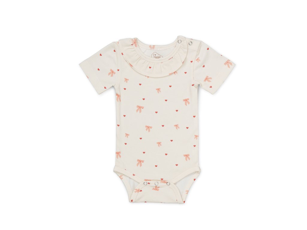 Jemný potisk mašliček a srdíček, doplněný o řasený límeček, dodává body něžný a romantický vzhled. Praktické patentky v rozkroku usnadňují přebalování a převlékání, což ocení každý rodič. Krátké rukávy jsou ideální volbou pro teplejší dny nebo jako spodní vrstva pod další oblečení.