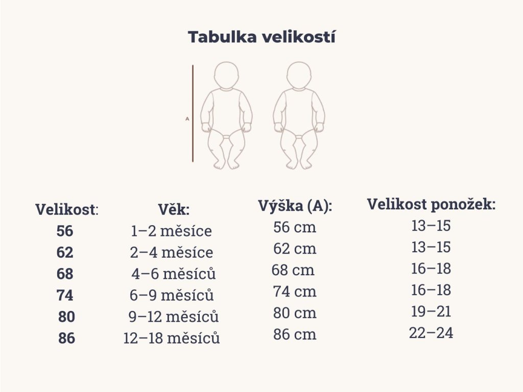| Podle velikosti: | 56 (0-3 měsíců), 62 (3-6 měsíců), 68 (6-9 měsíců) |