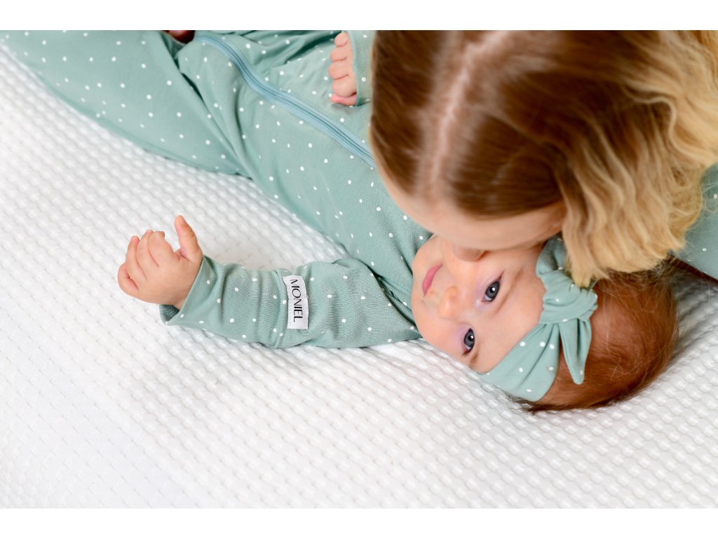 Dětská čelenka Dots mintová je stylovým a zároveň praktickým doplňkem pro miminka od prvních dnů života. Čelenka drží ouška na svém místě a zároveň zdobí hlavičku miminka. Je ušitá z elastického materiálu, takže skvěle drží na hlavičce, nepadá, nedělá otlaky a je velmi příjemná.