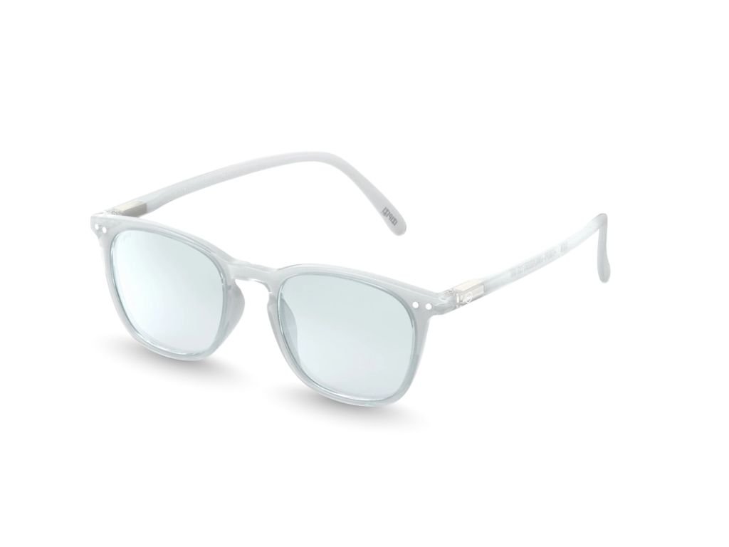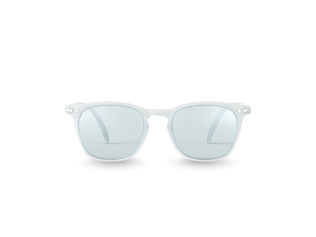 Model #E se vyznačuje strukturovaným, hranatým tvarem (trapezoid), který působí sebevědomě a moderně. Světle šedý odstín Moonlight Grey v kombinaci s lesklým povrchem rámu dodává brýlím čistý a sofistikovaný vzhled.