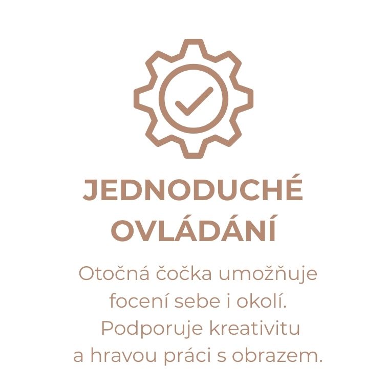 Velká tlačítka a přehledné menu umožňují dětem snadno pořizovat fotografie i videa bez pomoci dospělých. Otočná čočka o 180° podporuje kreativní focení i oblíbená dětská selfie.