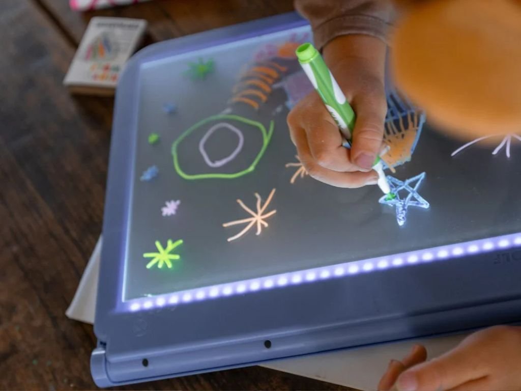 Tablet je vybaven měkkým LED displejem s třemi úrovněmi jasu, který usnadňuje reprodukci obrázků, písmen a čísel s přesností a radostí. Zadní neonová strana funguje jako tabule, která krásně zvýrazní tvary a barvy neonových fixů.