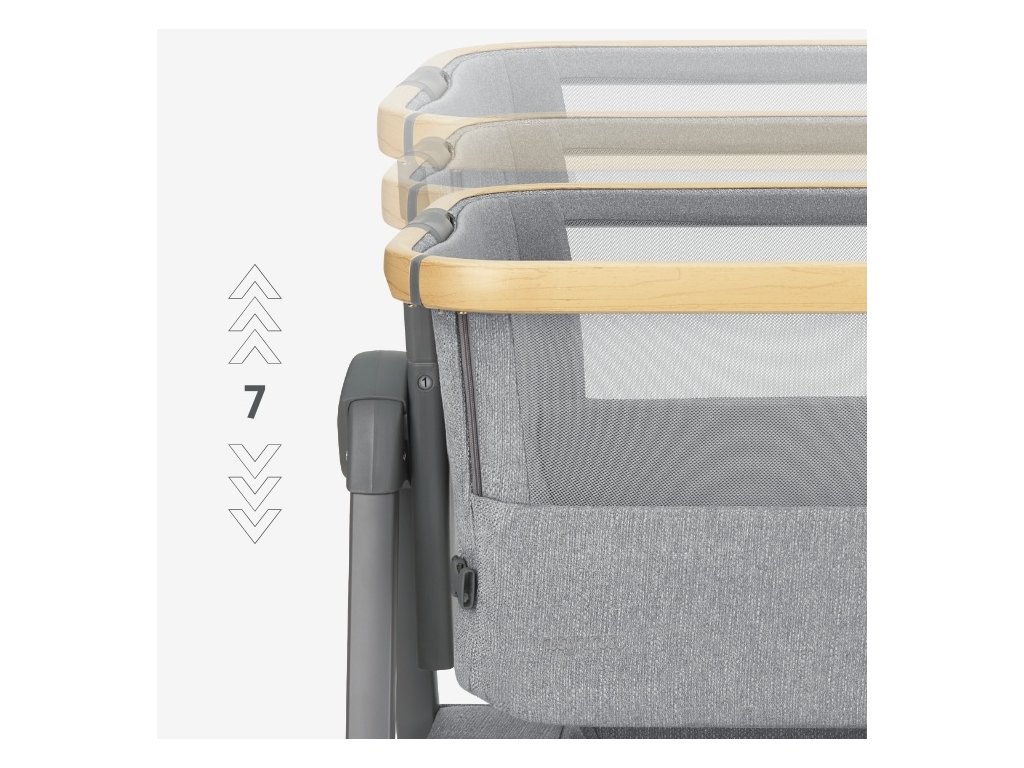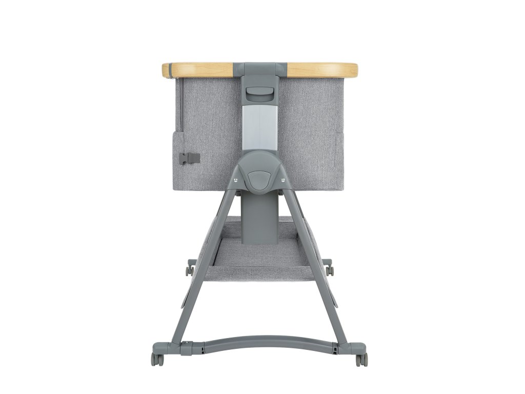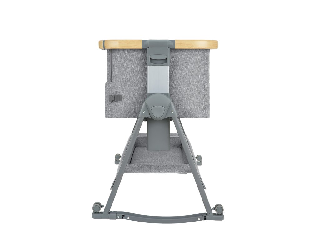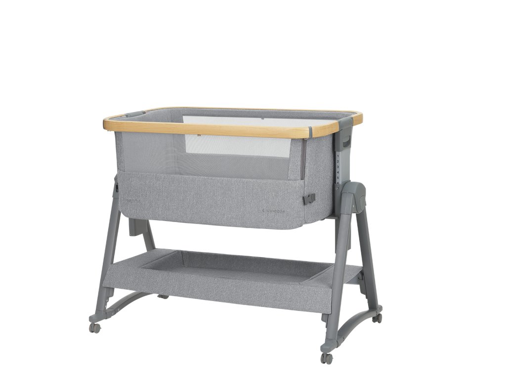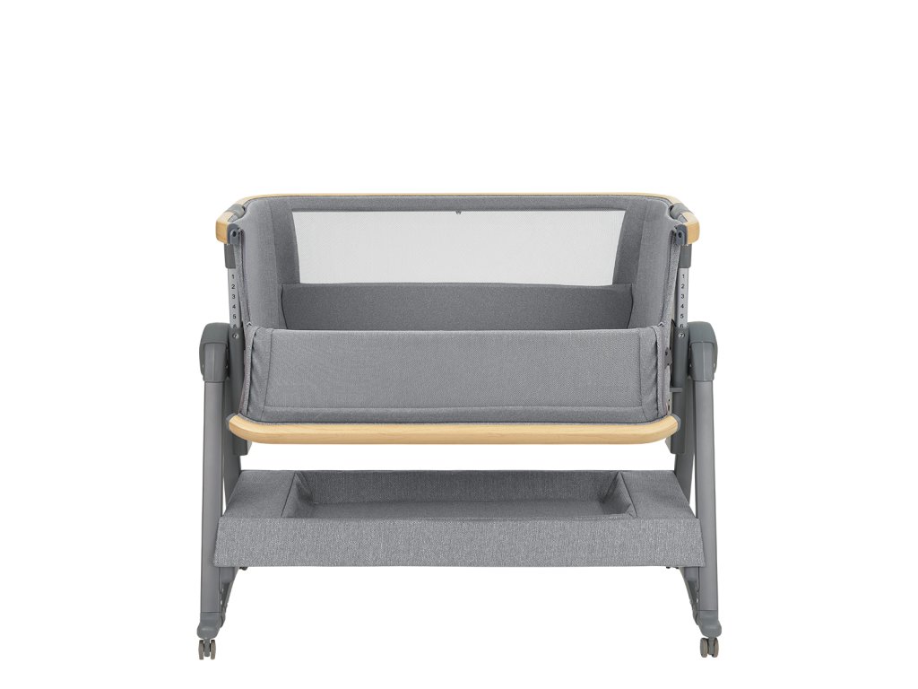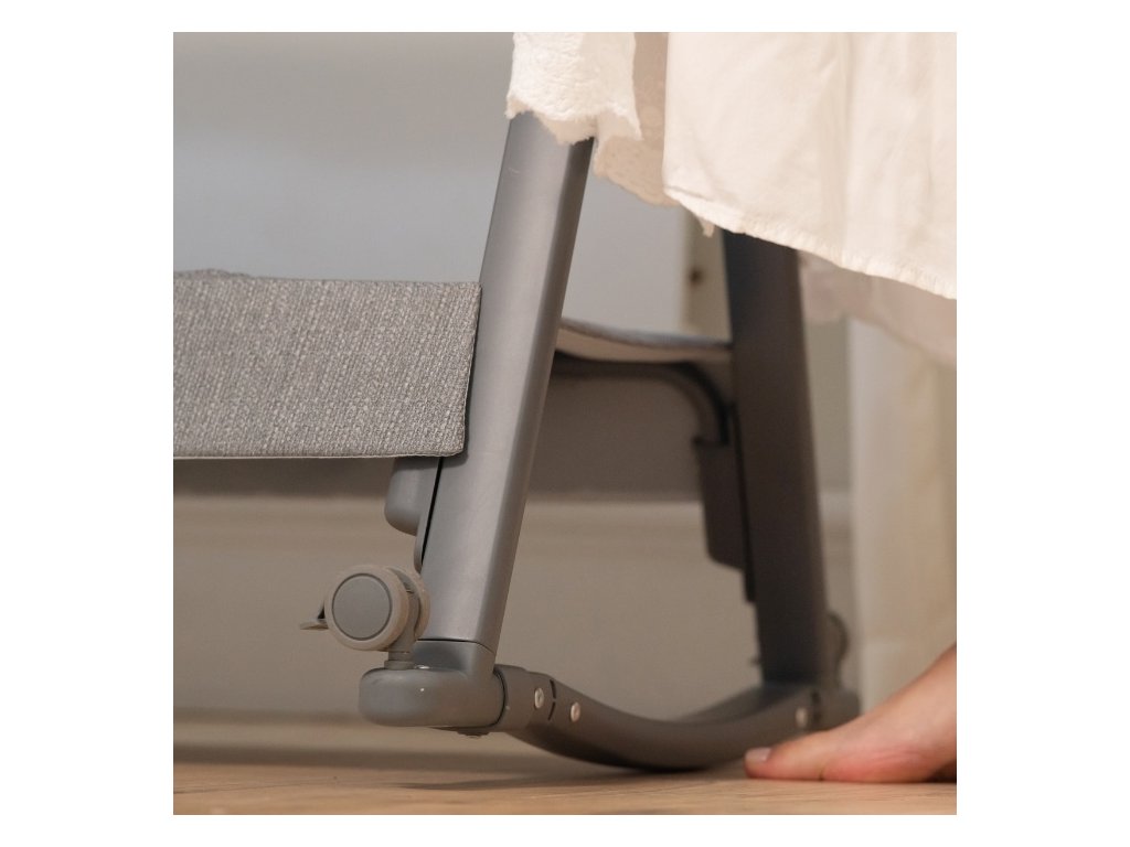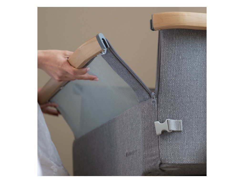 Postýlka se pomocí bezpečnostního popruhu pevně připevní k rodičovské posteli, takže zůstává stabilní a bezpečná po celou noc. Konstrukce z lehkého hliníku s elegantní povrchovou úpravou v dekoru dřeva působí čistě, moderně a snadno zapadne do každé ložnice.