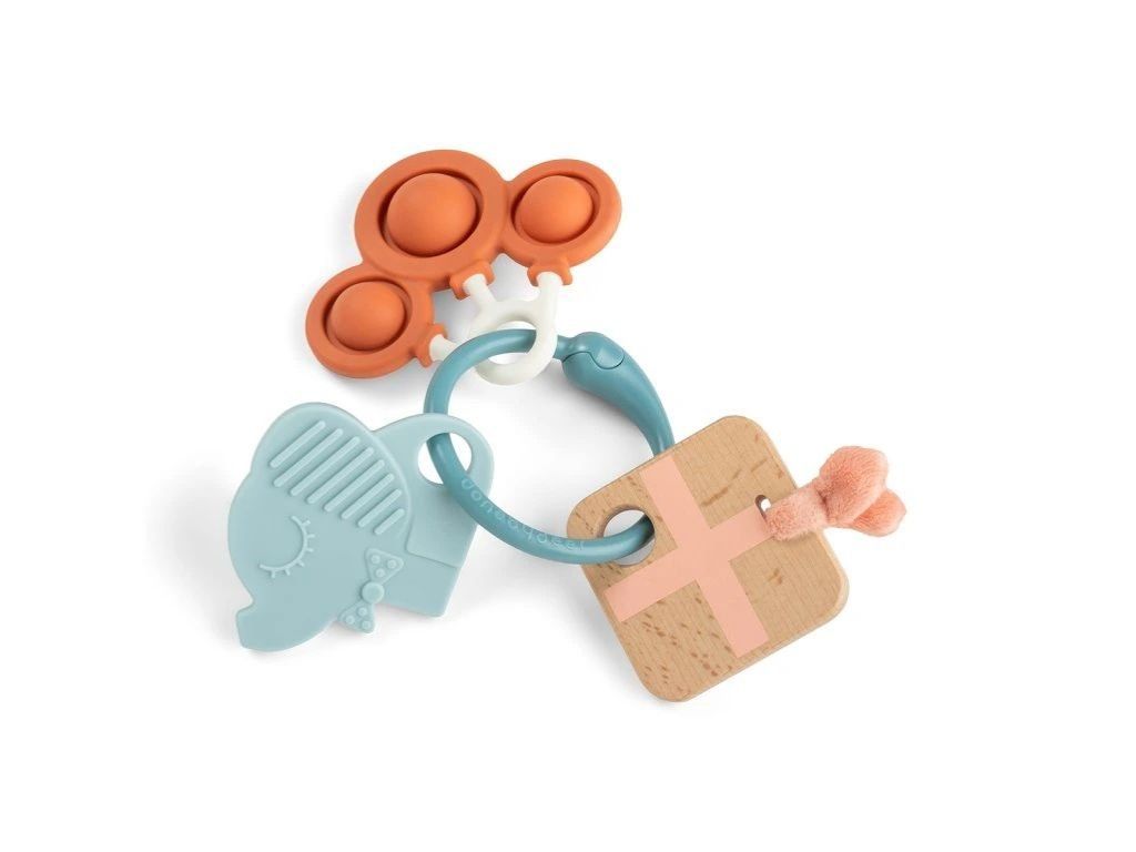 Různé materiály, textury a detaily stimulují hmat, zrak i koordinaci ruky a oka. Díky praktickému tvaru se kroužek snadno drží a je vhodný pro malé dětské ruce.