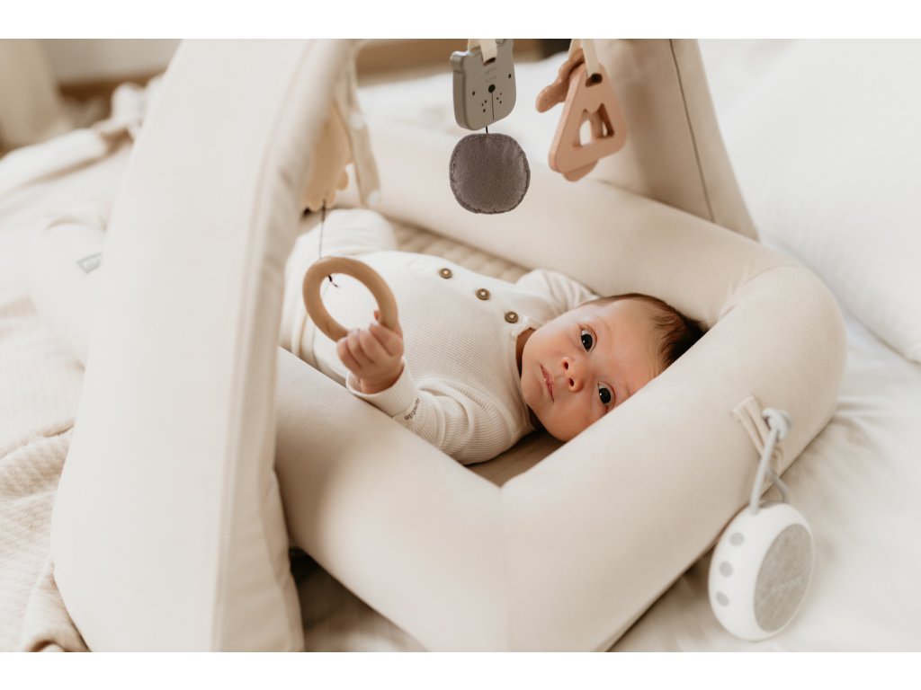 Hrazdička je multifunkční – lze ji využít jako součást hnízdečka Sleepee, ale také samostatně na hrací dece, podlaze, posteli nebo gauči. Díky nastavitelným závěsným poutkům snadno přizpůsobíte výšku hraček aktuálním potřebám dítěte. Pro novorozence se doporučuje umístění hraček nízko, v úrovni bříška, aby miminko nemuselo zvedat hlavičku a byl podpořen zdravý vývoj páteře.