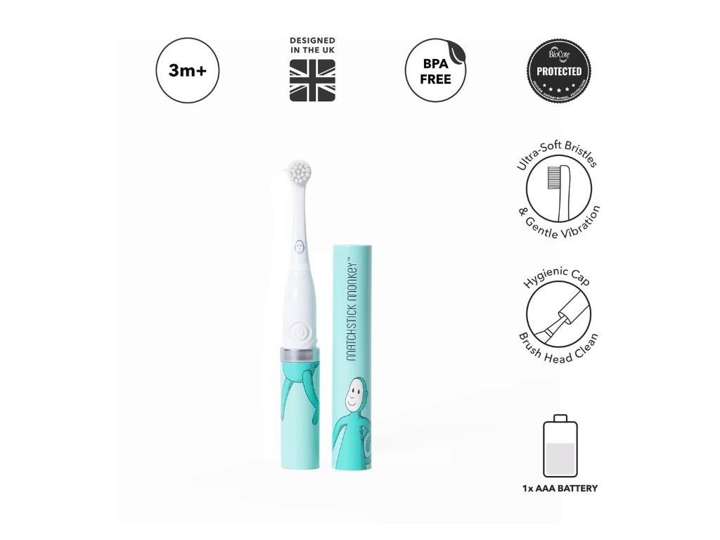 Matchstick Monkey Dětský sonický elektrický kartáček Monkey 3m+ pomáhá rodičům pečovat o první dětské zoubky šetrně, bezpečně a zábavně. Kartáček je navržen speciálně pro miminka od 3 měsíců věku a kombinuje jemné sonické vibrace s měkkými silikonovými štětinkami, které účinně odstraňují plak a zároveň chrání citlivé dásně.