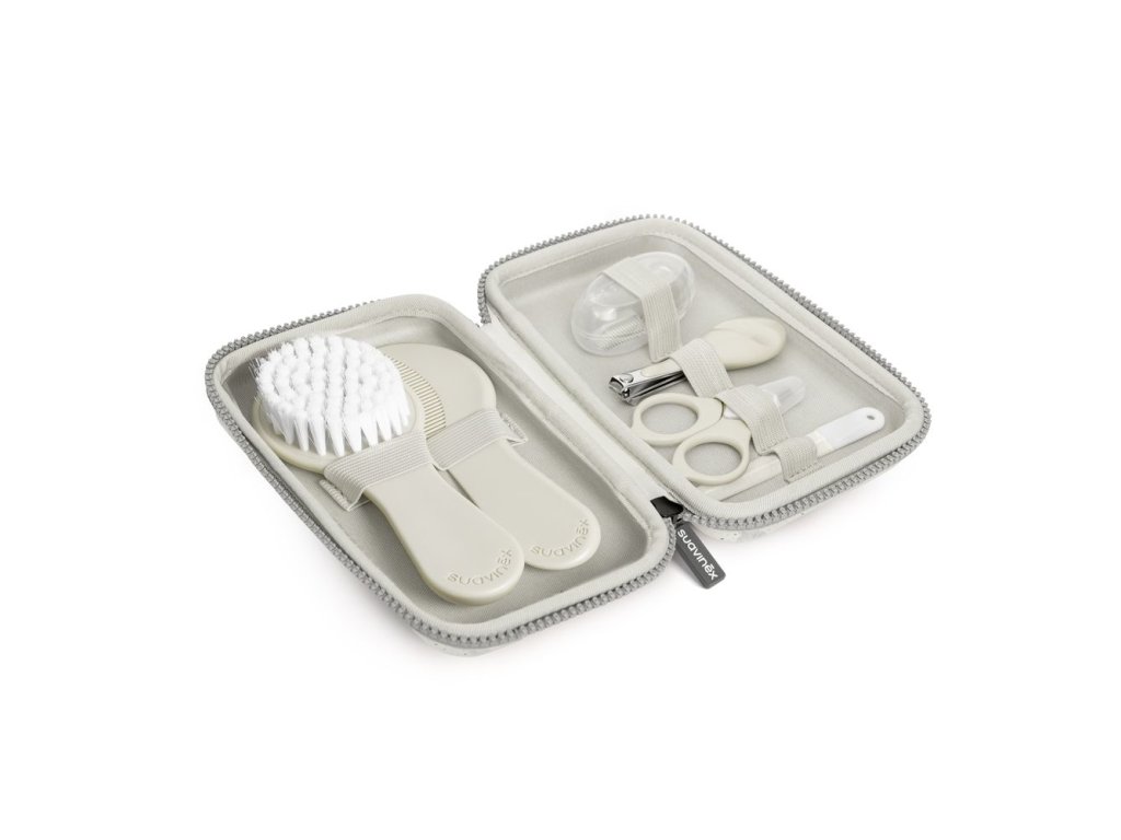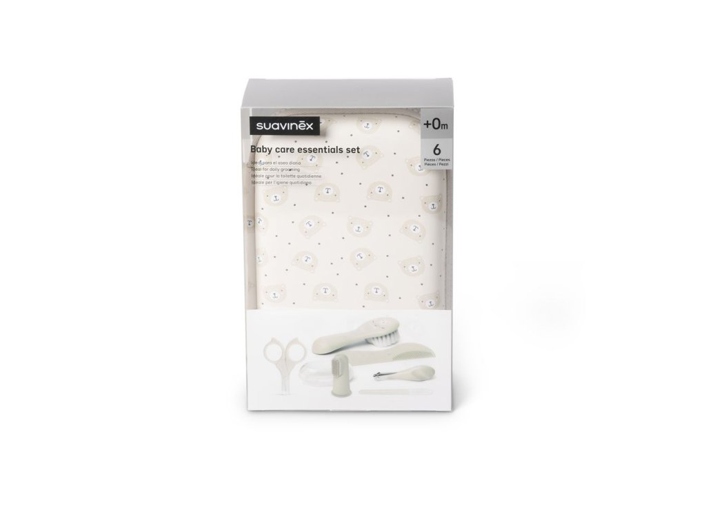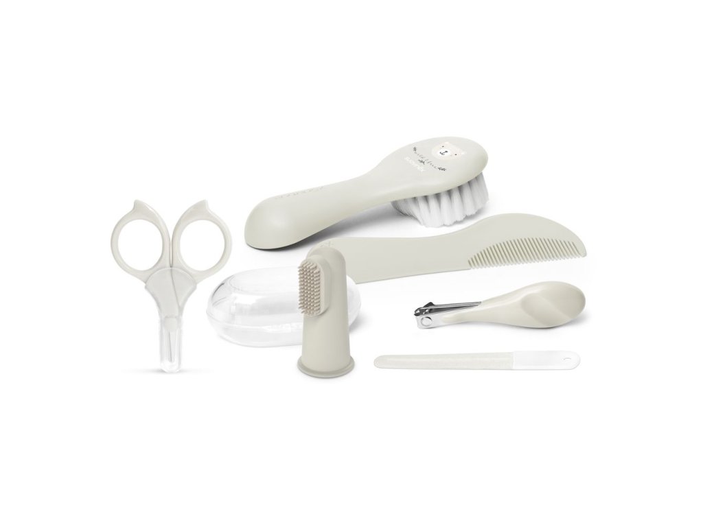 Sada obsahuje šest základních hygienických nástrojů navržených s ohledem na citlivost dětského těla. Najdete v ní nůžky se zaoblenou špičkou, kleštičky a pilníček na nehty, kartáč a hřebínek pro první jemné vlásky a také zubní kartáček na prst, který slouží k masáži dásní i čištění prvních zoubků.