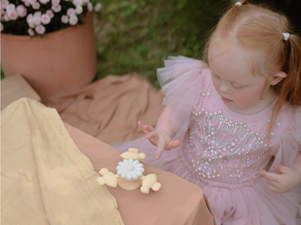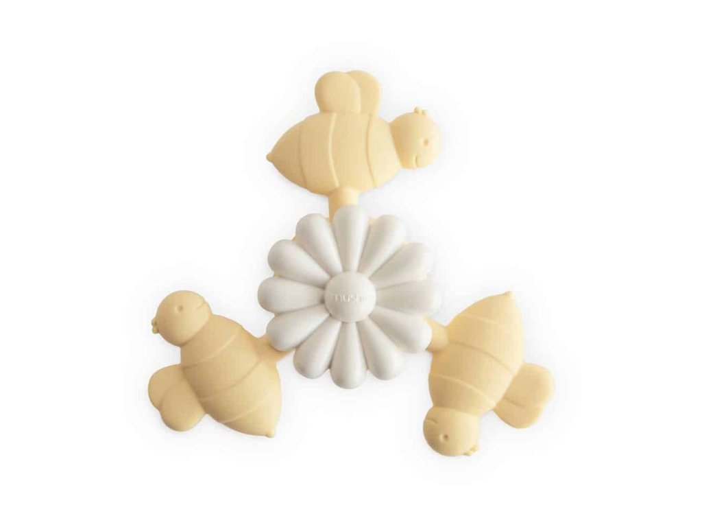 Spinner od Mushie přináší radost a zábavu vašemu děťátku díky svému hravému designu a jemným, uklidňujícím barvám. Měkké silikonové včelky lze snadno otáčet kolem kytičky, což vytváří vizuálně poutavý a uklidňující smyslový zážitek. Pevná přísavka udrží hračku na místě, ať už na jídelní židličce, dvířkách skříňky, stolku v letadle nebo ve vaně, čímž podporuje samostatné hraní.