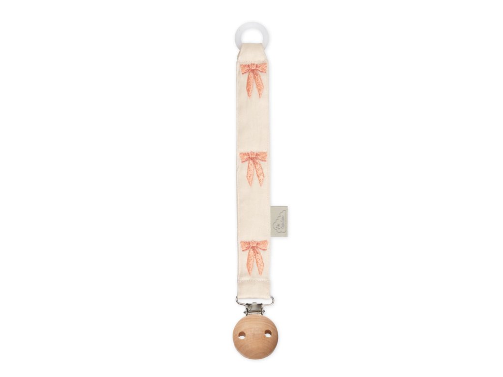 Je vyrobený z GOTS certifikované organické bavlny a zdobí ho něžná výšivka sladkých růžových mašliček, která mu dodává romantický, jemný vzhled. Praktická konstrukce myslí i na pohodlí používání: pevný kroužek ze 100% přírodního kaučuku drží dudlík bezpečně na místě, vnitřní výztuha brání kroucení a dřevěný klip s kovovou částí bez obsahu niklu umožňuje rychlé a spolehlivé připnutí na oblečení dítěte.