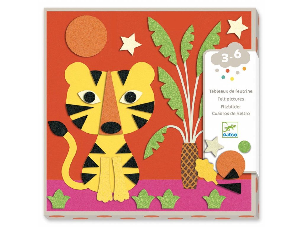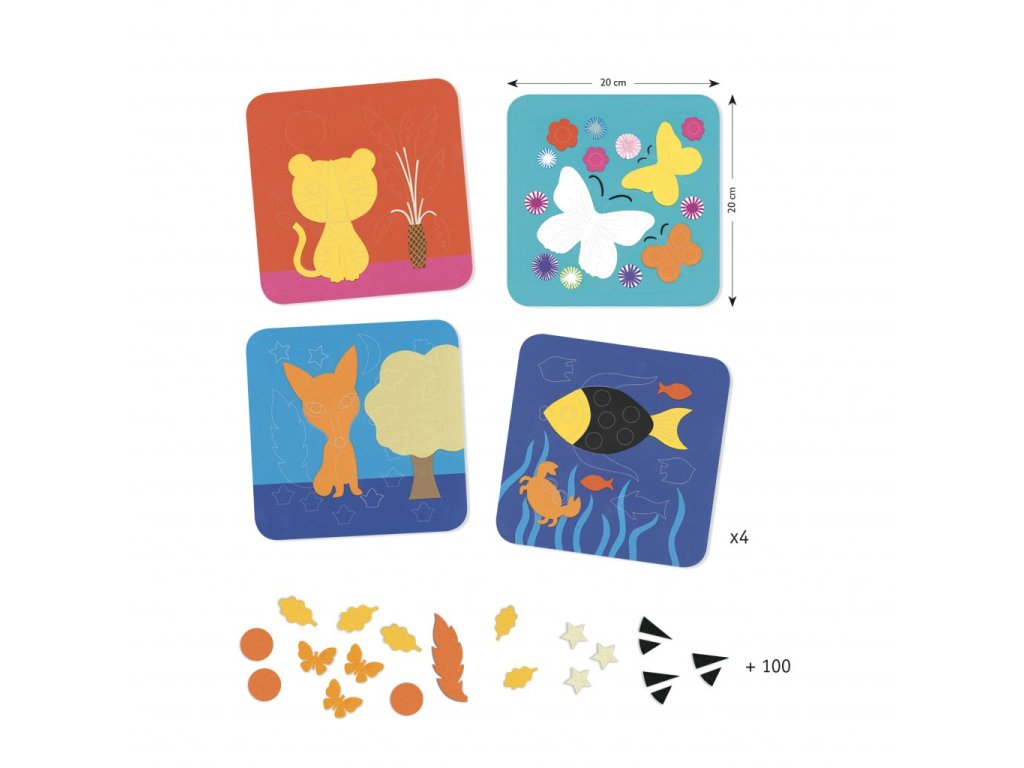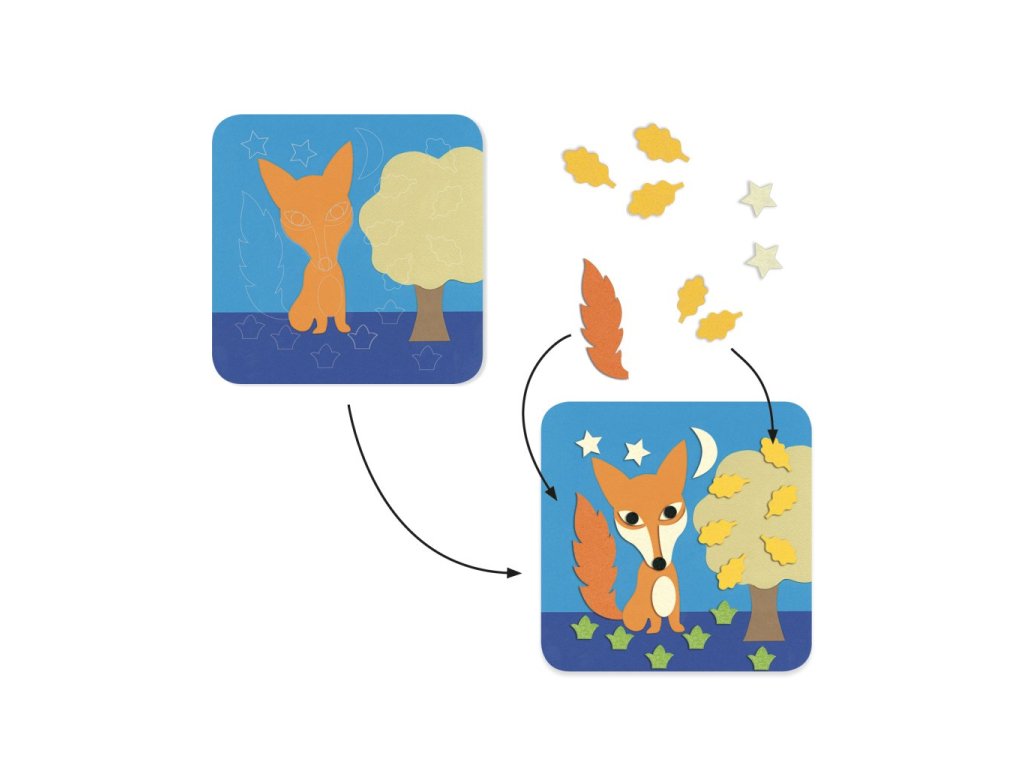 Kreativní sada Djeco Koláže z plsti – Sladká příroda nabízí dětem klidnou a smysluplnou výtvarnou činnost, při které dotvářejí obrázky zvířátek v přírodním prostředí. Pomocí plstěných dílků různých tvarů a barev děti pracují se šablonami a skládají vlastní kompozice.