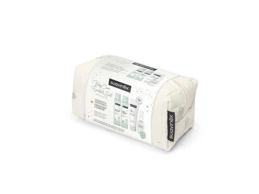 Suavinex kosmetická sada na cesty je praktickým a elegantním řešením pro každodenní péči o miminko doma i mimo domov. Všechny produkty jsou uložené v krásné bavlněné taštičce a tvoří ucelený pečující rituál – od koupání až po hydrataci a ochranu pokožky.