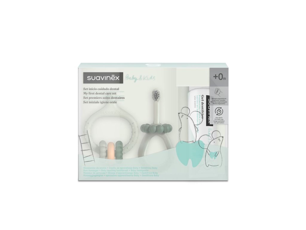 Masážní kartáček ze 100% silikonu jemně ulevuje podrážděným dásním během růstu zoubků díky různým tvarům a texturám. První zubní kartáček má extra měkké štětiny, ergonomickou rukojeť a bezpečnostní kroužek, který brání jeho přílišnému zasunutí do úst. Zubní pasta Suavinex Baby & Kids chrání mléčné zuby před zubním kazem, je bez lepku, má jemnou jahodovou příchuť a je vhodná již od narození.