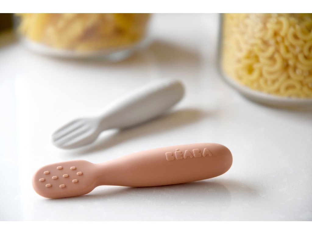 Seznamte své miminko s prvními příkrmy hravou a bezpečnou formou. Beaba První trénovací lžičky silikonové (2 ks) Terracotta / Velvet Grey byly navrženy speciálně pro nejmenší. Sada obsahuje dvě lžičky s texturovaným zakončením – jedna má podélné vroubky pro hladké pyré, druhá jemné výstupky pro první kousky tuhé stravy.