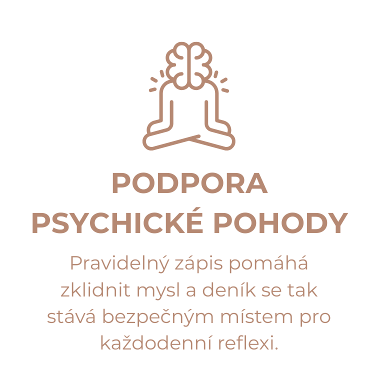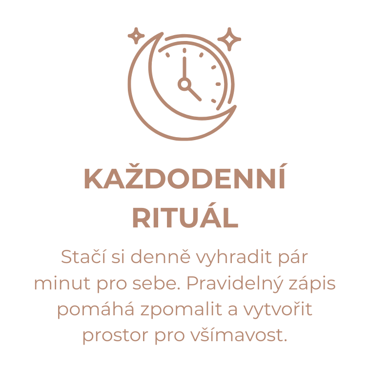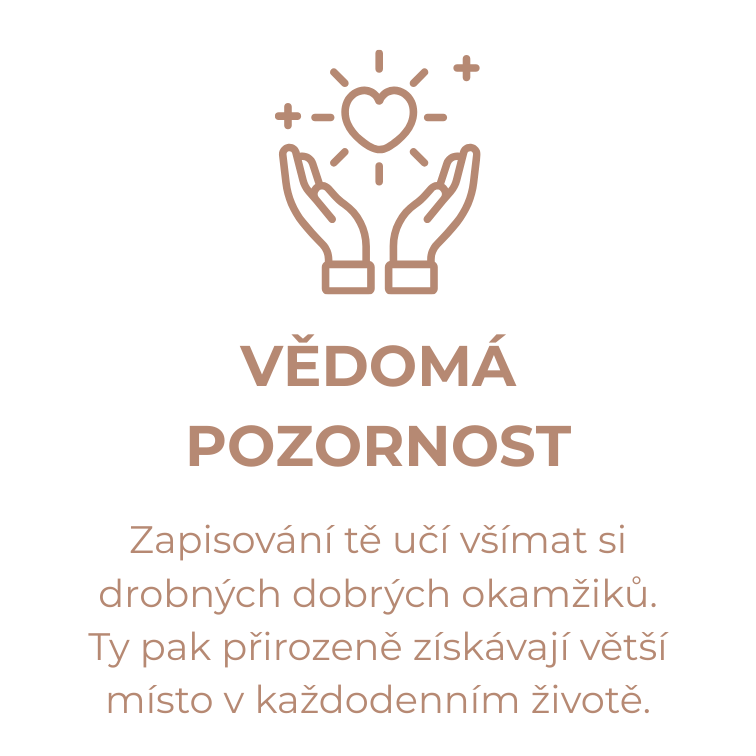 Občas se necháme strhnout proudem povinností a nepříjemných situací. Deník ti nabídne prostor se zastavit, přemítat a všimnout si drobných okamžiků, které dělají život bohatý. Platí jednoduchá věta: čemu dáváme pozornost, to roste. Když si každý den věnuješ třeba jen tři minuty, začneš postupně posilovat spojení s přítomným okamžikem – a tvoje mysl se přirozeně učí všímat si i toho dobrého.