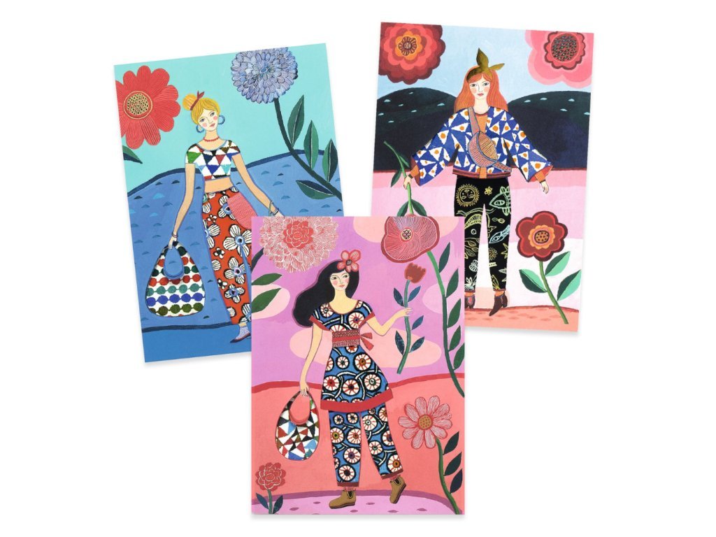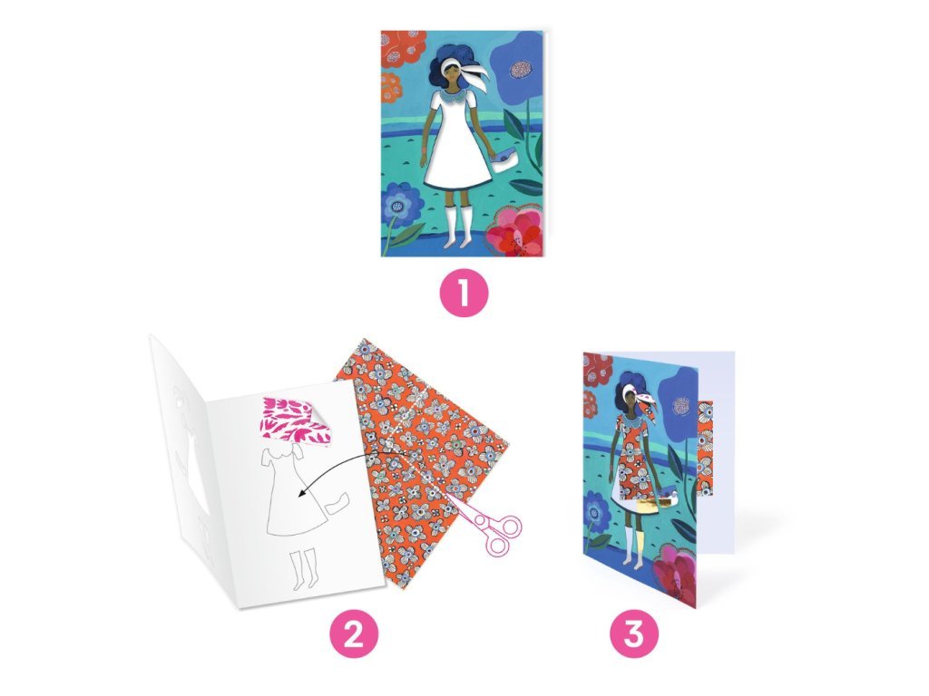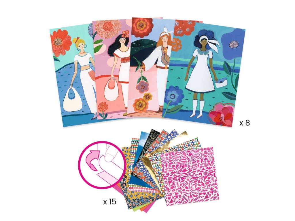 S touto kreativní sadou se děti promění v opravdové designéry. Z osmi originálních karet vytvoří jedinečné módní kreace – stačí obléknout čtyři modelky pomocí samolepicích papírů s různými vzory a efekty, jako je fluorescenční nebo metalický. Po přehnutí karty se objeví hotová scéna s krásně oblečenou postavou. Vše je připraveno tak, aby byla aktivita jednoduchá, zábavná a bez potřeby lepidla.