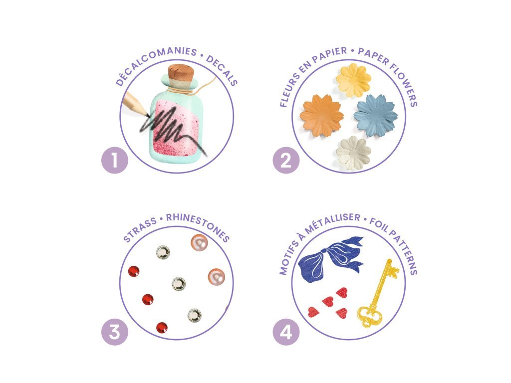 Sada obsahuje: 4 ilustrované podstavce, stírací samolepky, papírové květiny, 100 samolepicích kamínků, fóliové prvky a návod krok za krokem, který děti provede celým procesem tvorby.