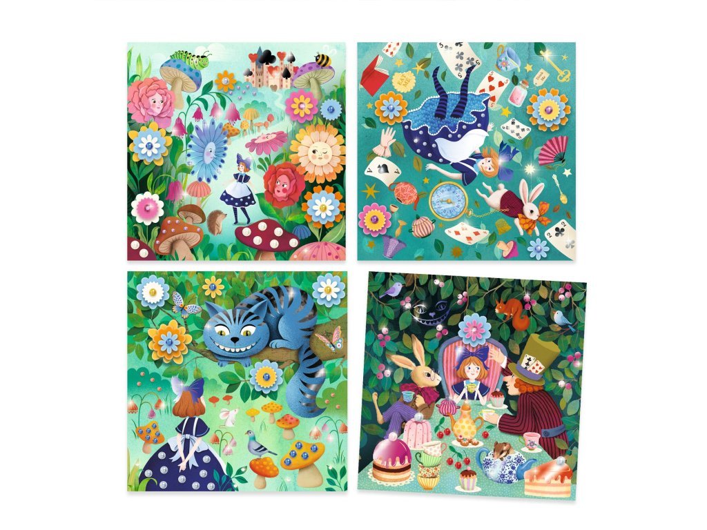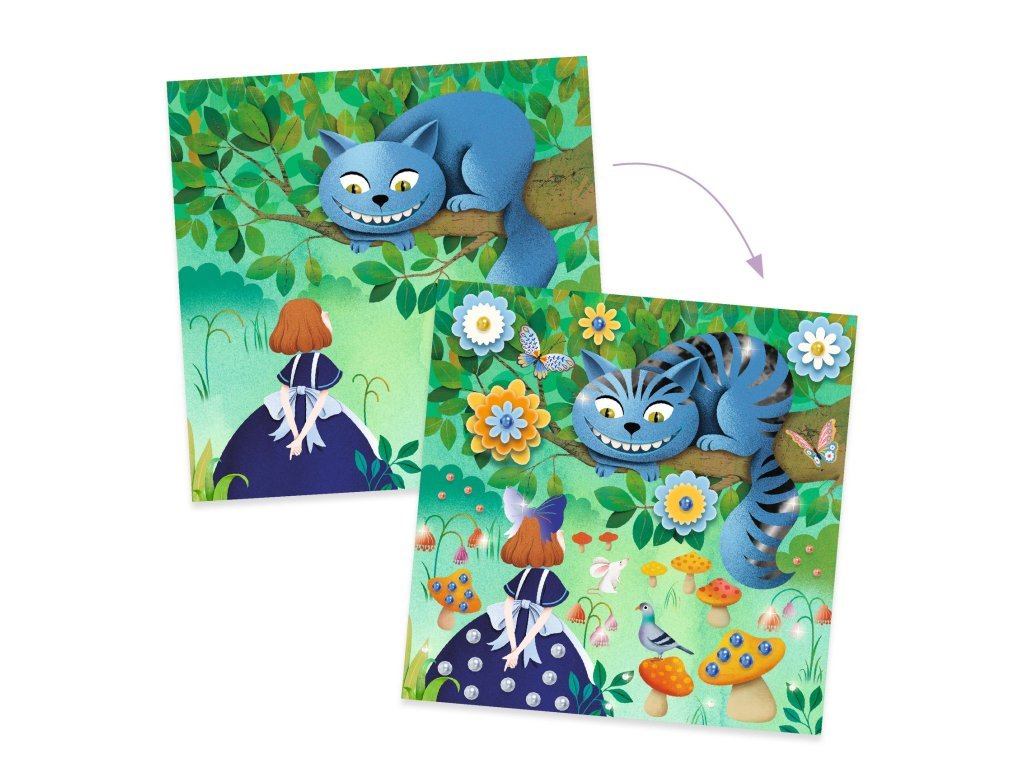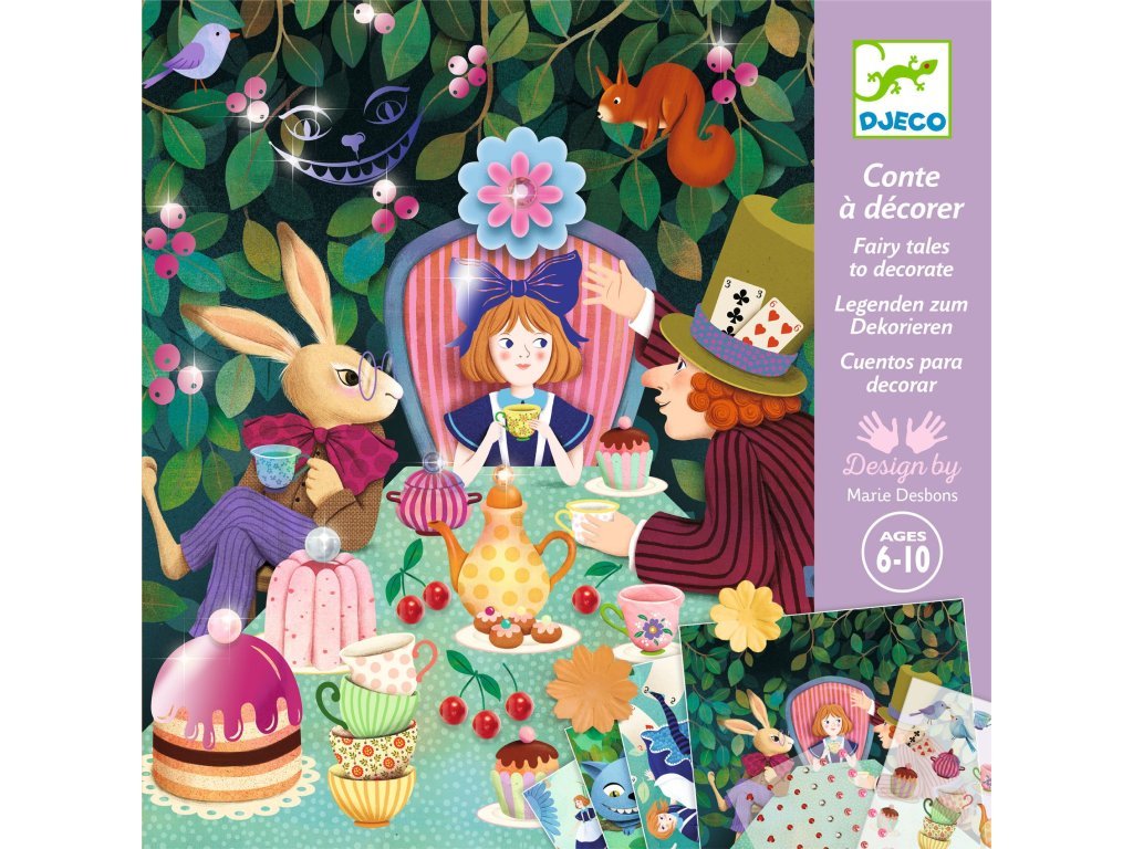 DJECO Pohádky k dotvoření - Alenka v říši divů je výtvarná sada, která kombinuje 4 různé techniky zdobení. Děti mají k dispozici 4 ilustrované podstavce o velikosti 20 x 20 cm, které mohou ozdobit stíracími samolepkami, papírovými květinami, samolepicími kamínky a zdobící fólií. Tato sada je ideální pro rozvoj jemné motoriky a kreativity, přičemž děti tvoří nádherné scény inspirované pohádkou Alenka v říši divů.
