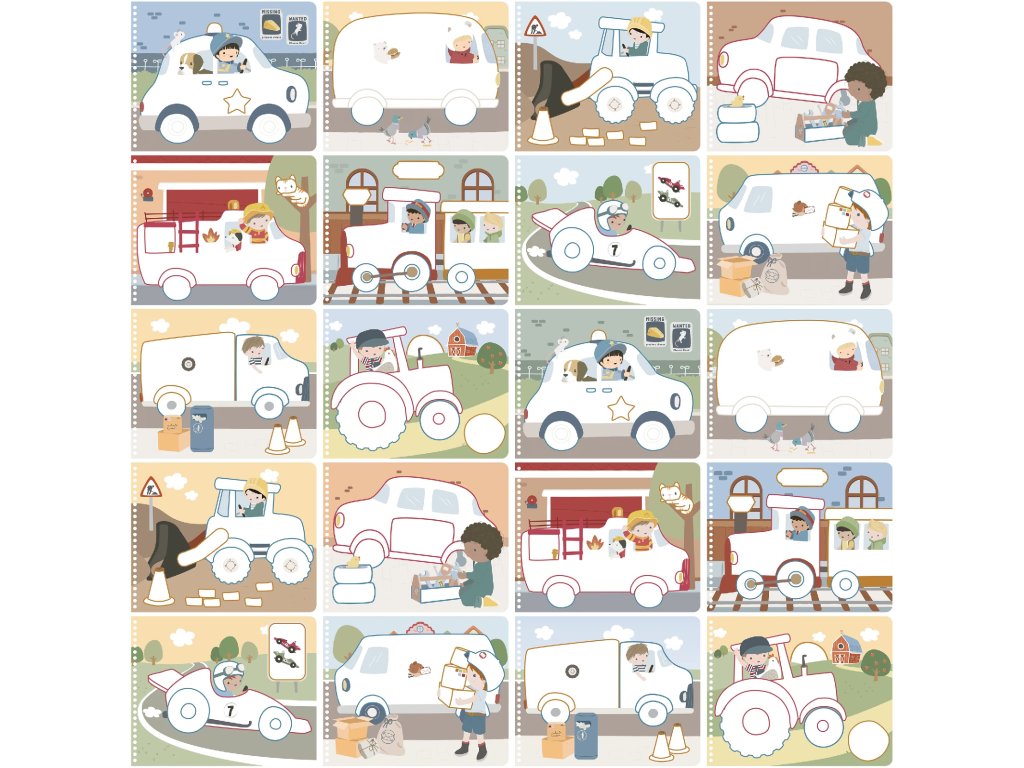 Soubor obsahuje 20 předtištěných obrázků a 10 prázdných stránek, na které mohou děti kreslit podle vlastní představivosti. Díky pevné spirále se omalovánky snadno otáčí a pohodlně drží otevřené na stole.