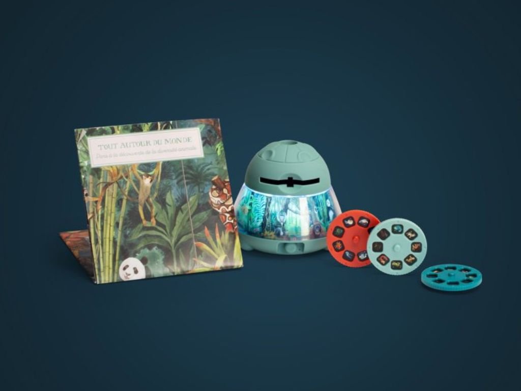 Cestování kolem světa ještě nikdy nebylo tak kouzelné! Promítačka a noční světlo Moulin Roty z kolekce Tout autour du monde promění dětský pokoj v malé kino plné zvířecích dobrodružství.
