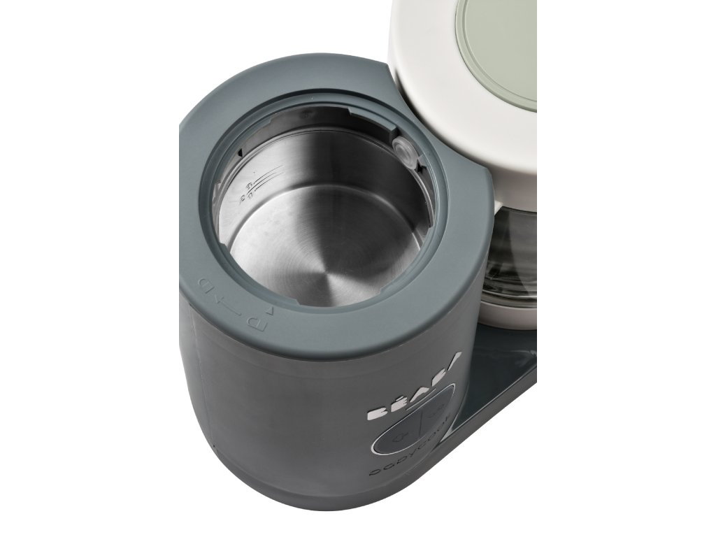 Model Babycook Neo má moderní a praktické provedení: skleněnou nádobu 1250 ml, nerezový vkládací košík 1000 ml a nerezový zásobník na vodu s vnitřní ryskou. Široký vstupní otvor zásobníku usnadňuje doplňování vody i čištění.