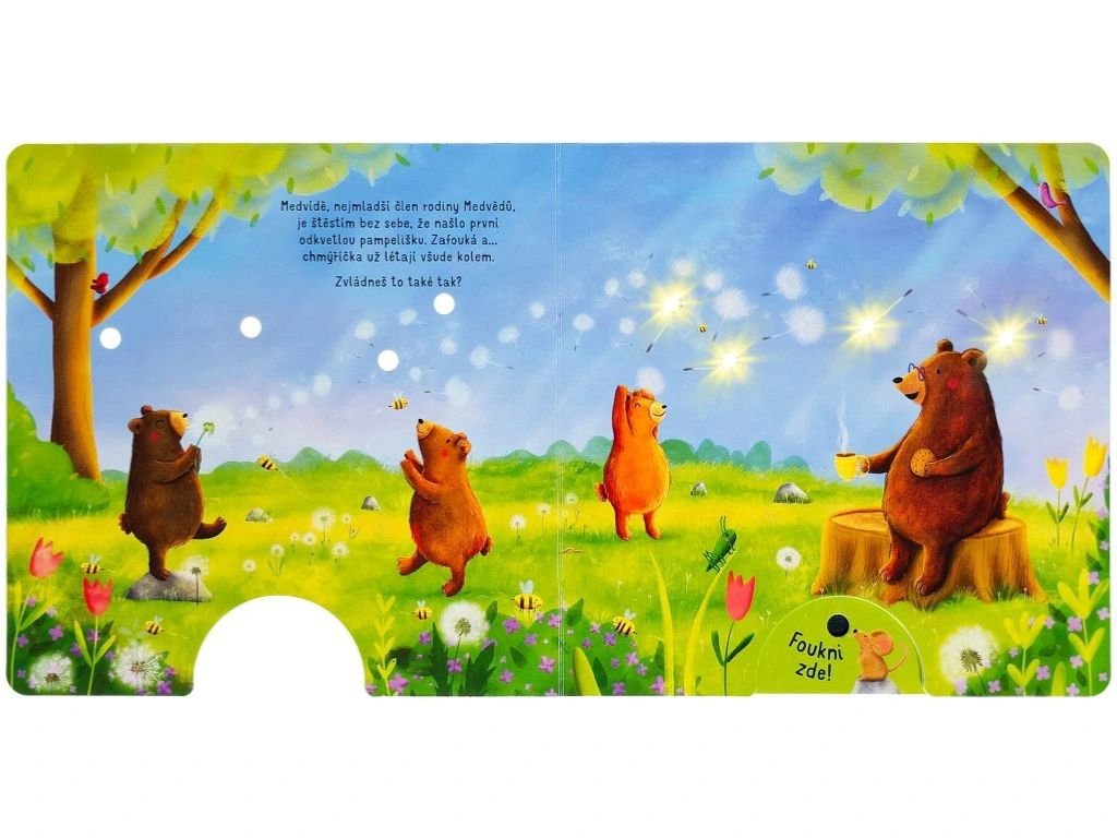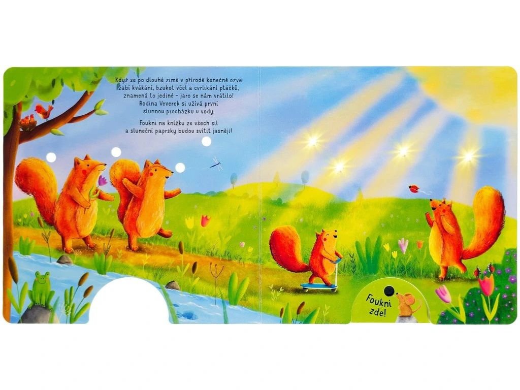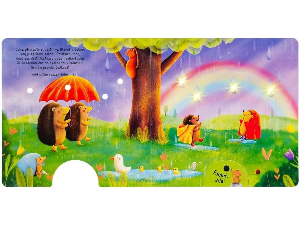 Foukni, rozsviť, počti si - fouknutím rozsviť světélka. Slyšíš to také? Po dlouhé zimě se zas ozývá žabí kvákání, bzukot včel a cvrlikání ptáčků. To znamená jediné - jaro se nám vrátilo! Všechna zvířátka se z toho radují. Medvíďata vesele sbírají pampelišky. Velikonoční zajíčci malují vajíčka. A ježčí rodinka? Užívá si aprílové počasí a skotačí v kalužích. Cák! Foukni na knížku, nechej rozzářit světélka a přivítej s námi jaro!
