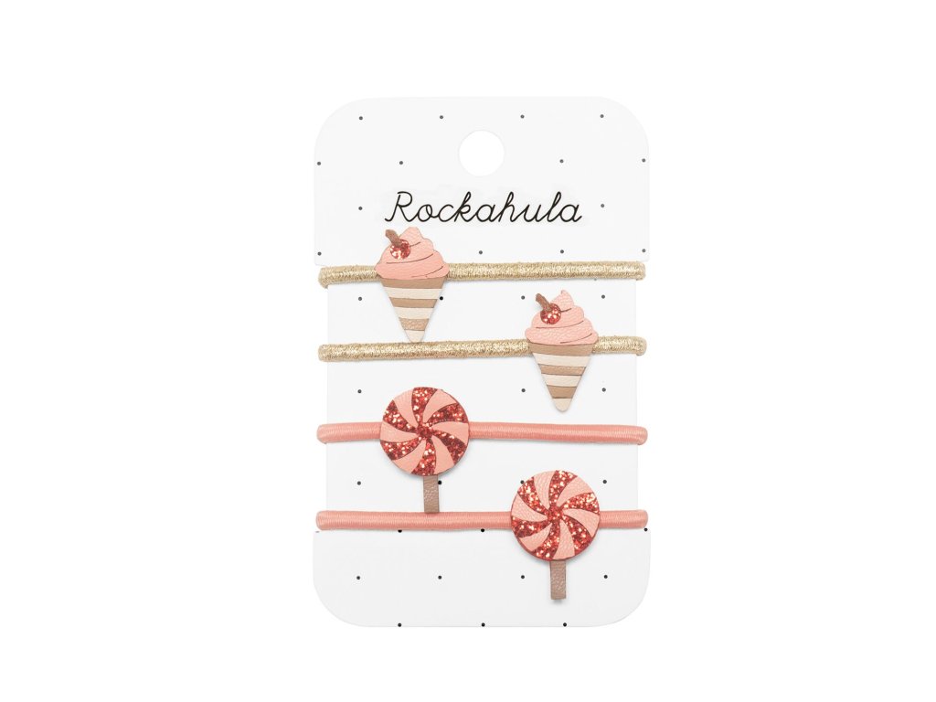 Set Very Cherry Ice Cream Ponies od Rockahula je jako stvořený pro léto plné radosti a barev. Balení obsahuje čtyři gumičky do vlasů – dvě zdobí točené zmrzlinové kornouty s třešničkou na zlatých elastických gumičkách, další dvě pak třpytivá spirálová lízátka na růžových gumičkách.