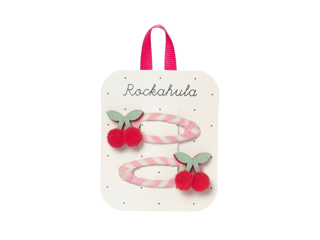 Sladké třešničky zdobí tyto zacvakávací sponky obalené proužkovanou rypsovou stuhou (grosgrain)! Každá třešnička má propracované zelené stopky a šťavnaté červené „plody“ v podobě měkoučkých bambulek, které vypadají naprosto neodolatelně.