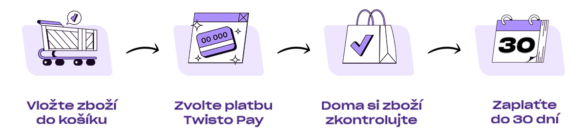 V okamžiku, kdy Vám odešleme objednávku, vám v mailu přistane faktura. Na zaplacení máte 30 dní. Jakmile vám zboží dorazí domů, v klidu si ho prohlédnete. Do té doby neplatíte ani korunu, narozdíl od dobírky, kterou musíte zaplatit ještě před prohlédnutím doručeného balíku. Zároveň se nemusíte obávat, že na zaplacení zapomenete. Twisto se vám s platbou několikrát dopředu připomene mailem. Svůj nákup pak můžete uhradit bankovním převodem, online kartou, složenkou u České pošty nebo i bankovním vkladem.