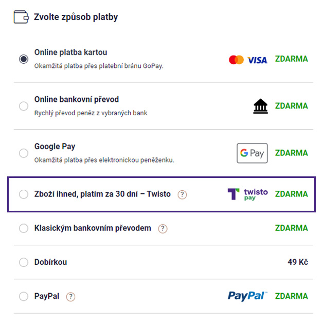 Dále pak zvolíte způsob dopravy zboží a jako způsob platby vyberete možnost Twisto - Zboží ihned, platím za 30 dní. Nákupní košík vás následně přesměruje na Twisto platformu, kde se zaregistrujete a je to. Následně Vám zasíláme vybrané zboží.