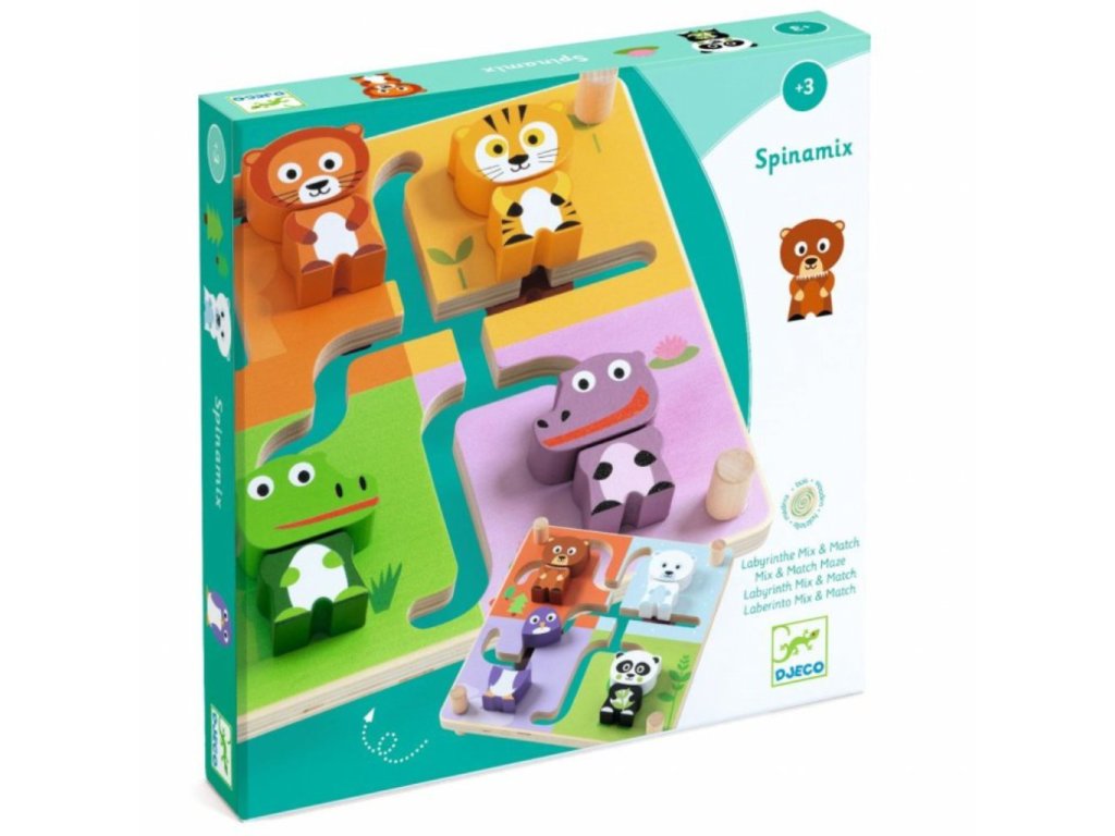 Posuvné bludiště Djeco Spinamix nabízí dětem hravou a zároveň rozvíjející aktivitu, při které spojují hlavičky a tělíčka zvířátek pomocí posouvání dílků v labyrintu. Z jedné strany herní desky děti skládají čtyři zvířátka, po otočení desky mohou stejným způsobem vytvořit další čtyři odlišné motivy.
