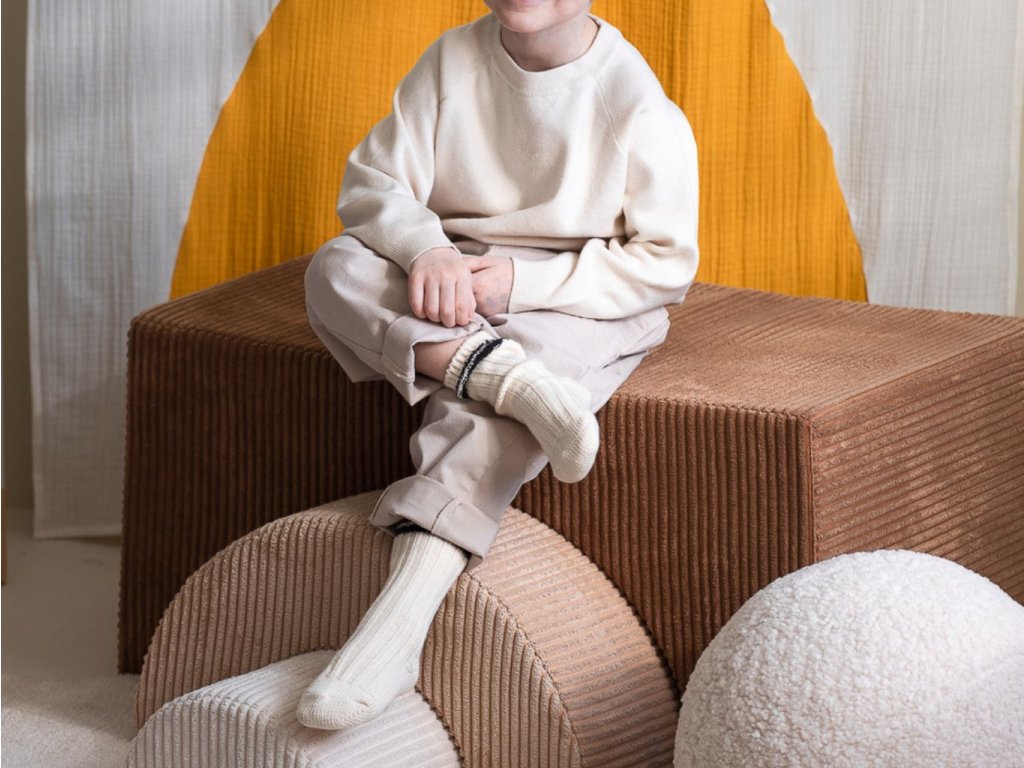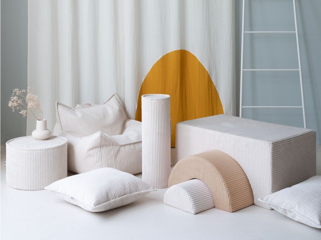 Potah je z měkkého širokého manšestru (wide wale corduroy) vyrobeného z recyklovaných PET lahví a má certifikace GRS® a OEKO-TEX®. Uvnitř se nachází ISO certifikovaná polyuretanová pěna, která poskytuje pohodlí a stabilitu. Praktický zip umožňuje potah sundat a vyprat podle pokynů, takže set zvládne i každodenní dětské používání.