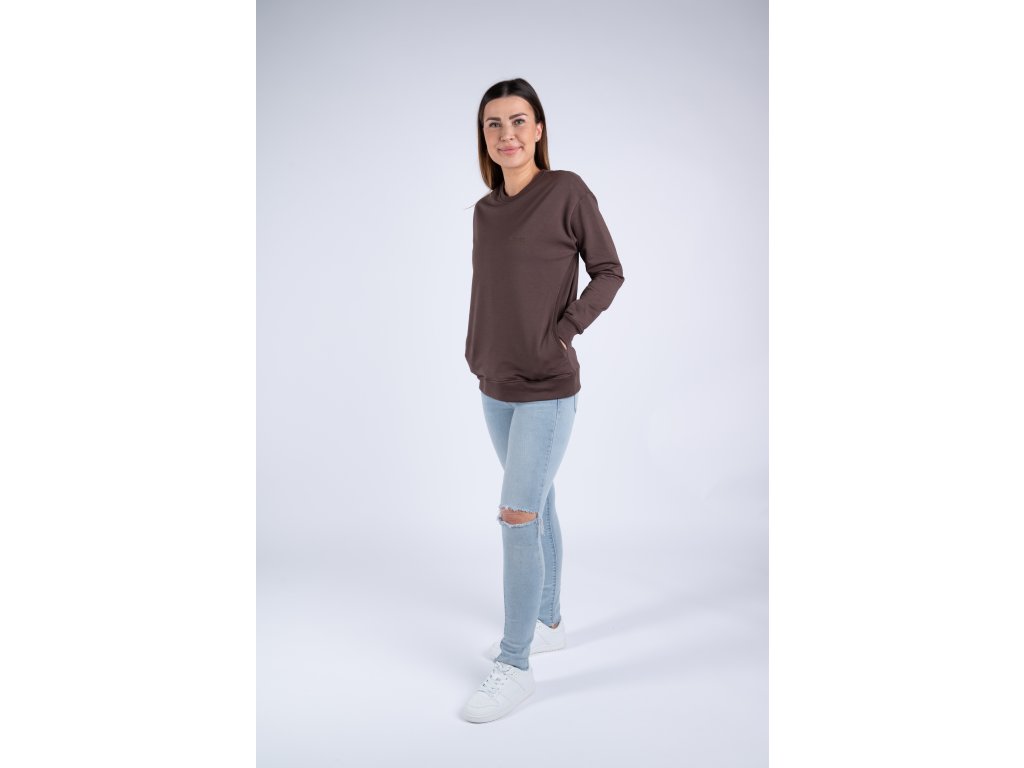 Použitý materiál je velmi elastický, mimořádně hebký a příjemný na dotek. Látka byla vyrobena na míru tak, aby si dlouhodobě zachovala svou kvalitu, netvořila žmolky a zůstala krásná i při častém praní. Mikina se nemačká, a pokud nechcete, není nutné ji žehlit.