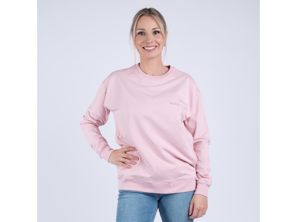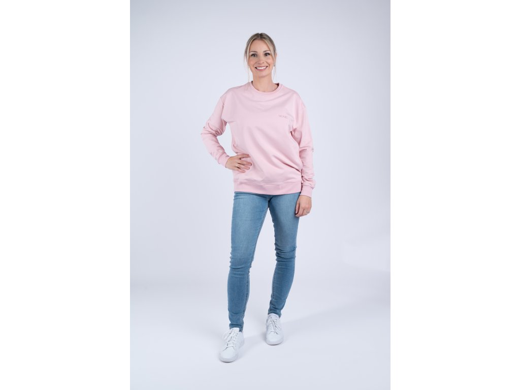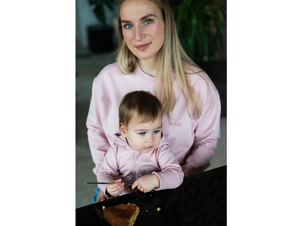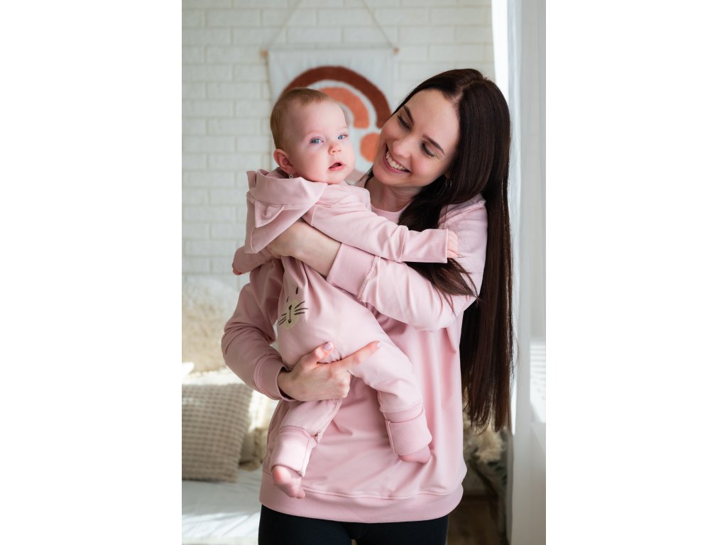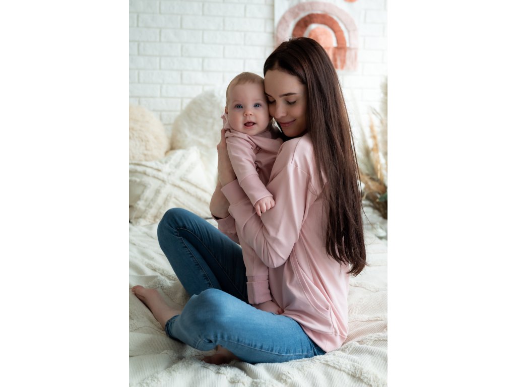 Krátký střih mikiny končí přibližně v oblasti boků a působí moderně a žensky. Mikina je dostatečně prostorná, takže ji lze pohodlně nosit už během těhotenství a následně po celou dobu kojení i mateřství. Střih je navržen tak, aby lichotil každé postavě a poskytoval maximální volnost pohybu.