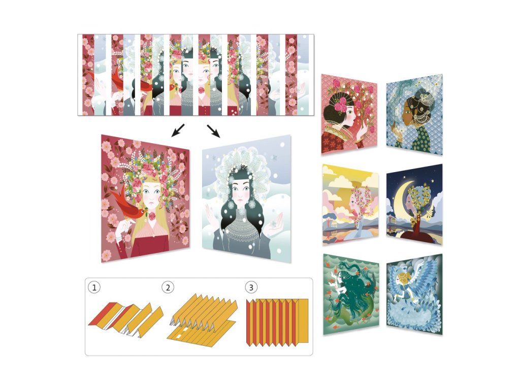Kinetické obrázky Djeco – Královny nabízejí originální výtvarnou techniku, která děti zaujme hned několikrát. Při skládání proužků vzniká obraz, který se podle úhlu pohledu proměňuje a ukazuje dva různé motivy v jednom díle. Výsledný efekt je překvapivý a pro děti velmi atraktivní.