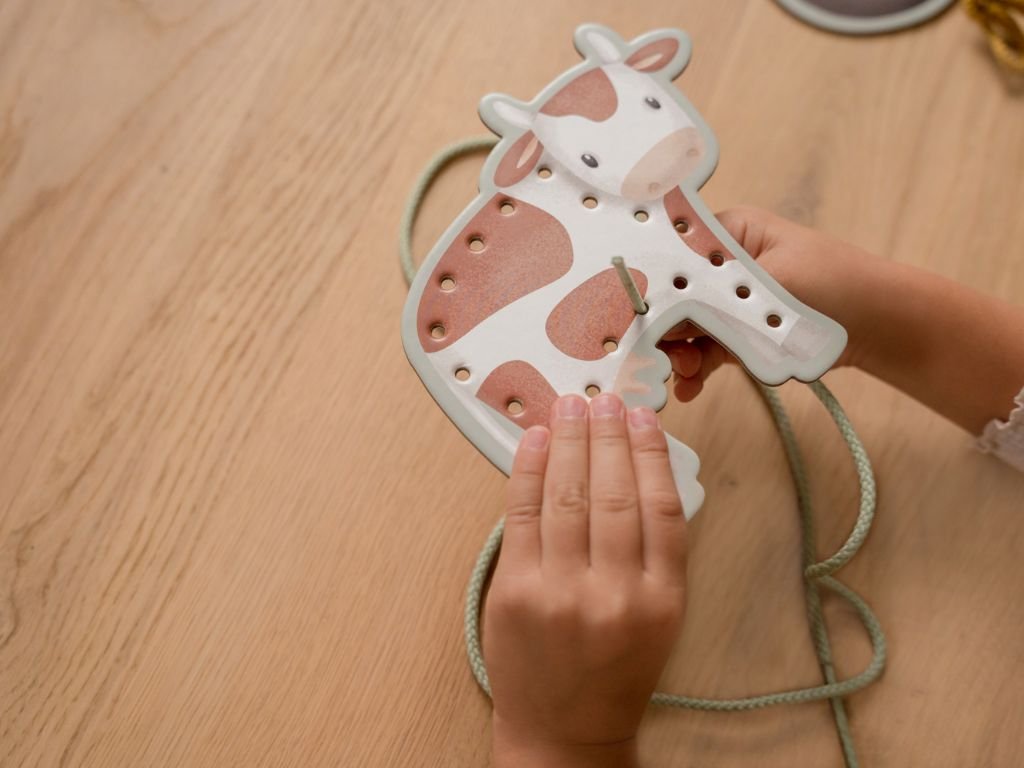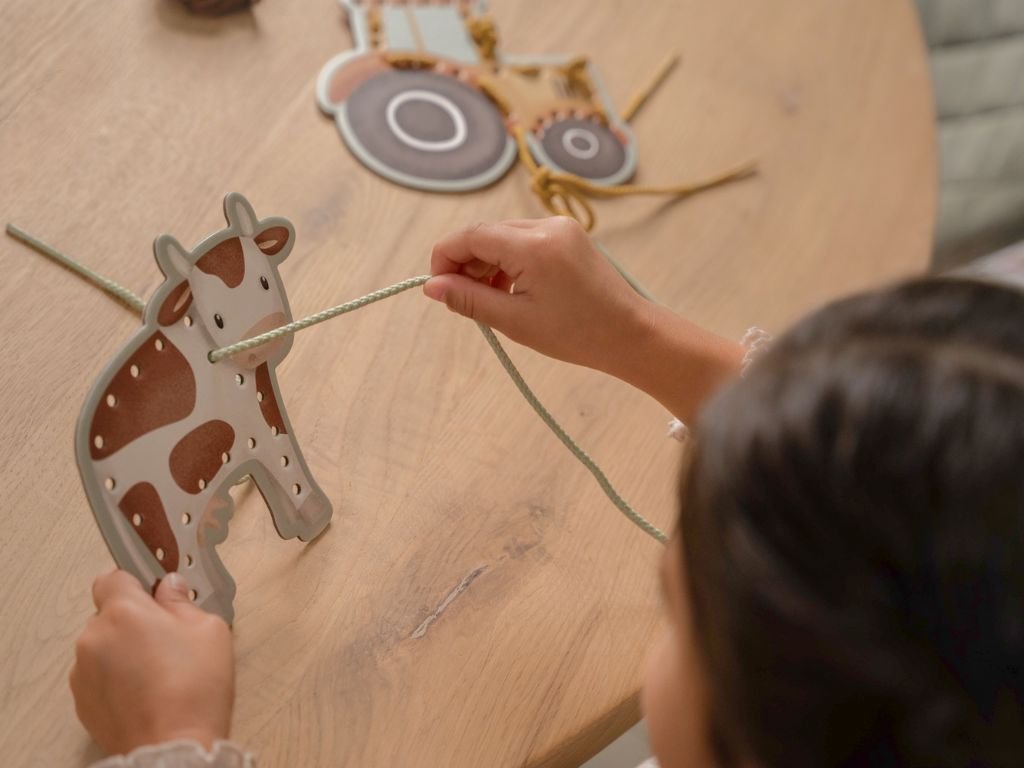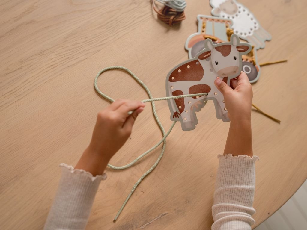 Sada pěti kartonových karet s otvory pro provlékání šňůrek je originální hračkou, která vaše dítě zabaví a zároveň podpoří jeho kreativitu i trpělivost. Karty v podobě kravičky, ovečky, slepičky, traktoru a stáje jsou vyrobené z kvalitního pevného kartonu a množství otvorů nabízí nekonečné množství způsobů provlékání šňůrky. Šňůrka v podobě tkaničky s plastovým zakončením umožňuje snadné navlékání i malým dětským ručičkám.
