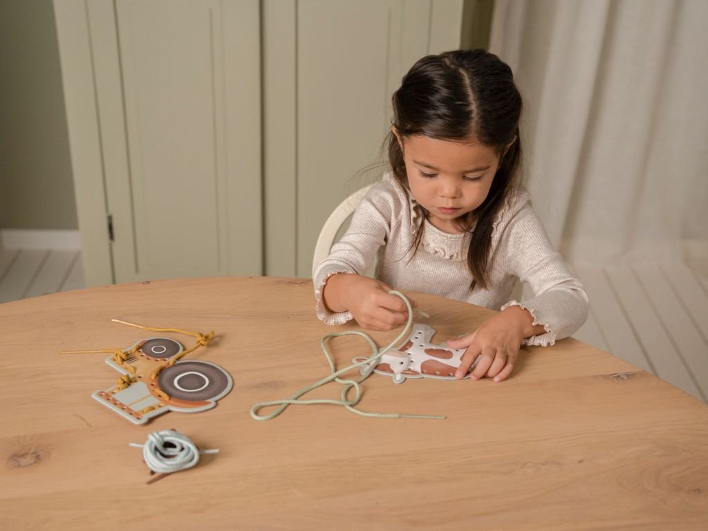 Šněrování pomáhá rozvoji jemné motoriky a koordinace ruka / oko dítěte.